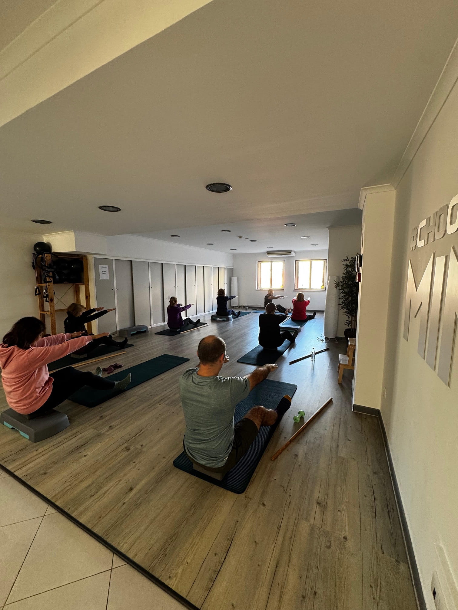 As aulas de Pilates decorrem em Small Group Classes, permitindo acompanhamento próximo, correção contínua e um ambiente seguro e motivador.